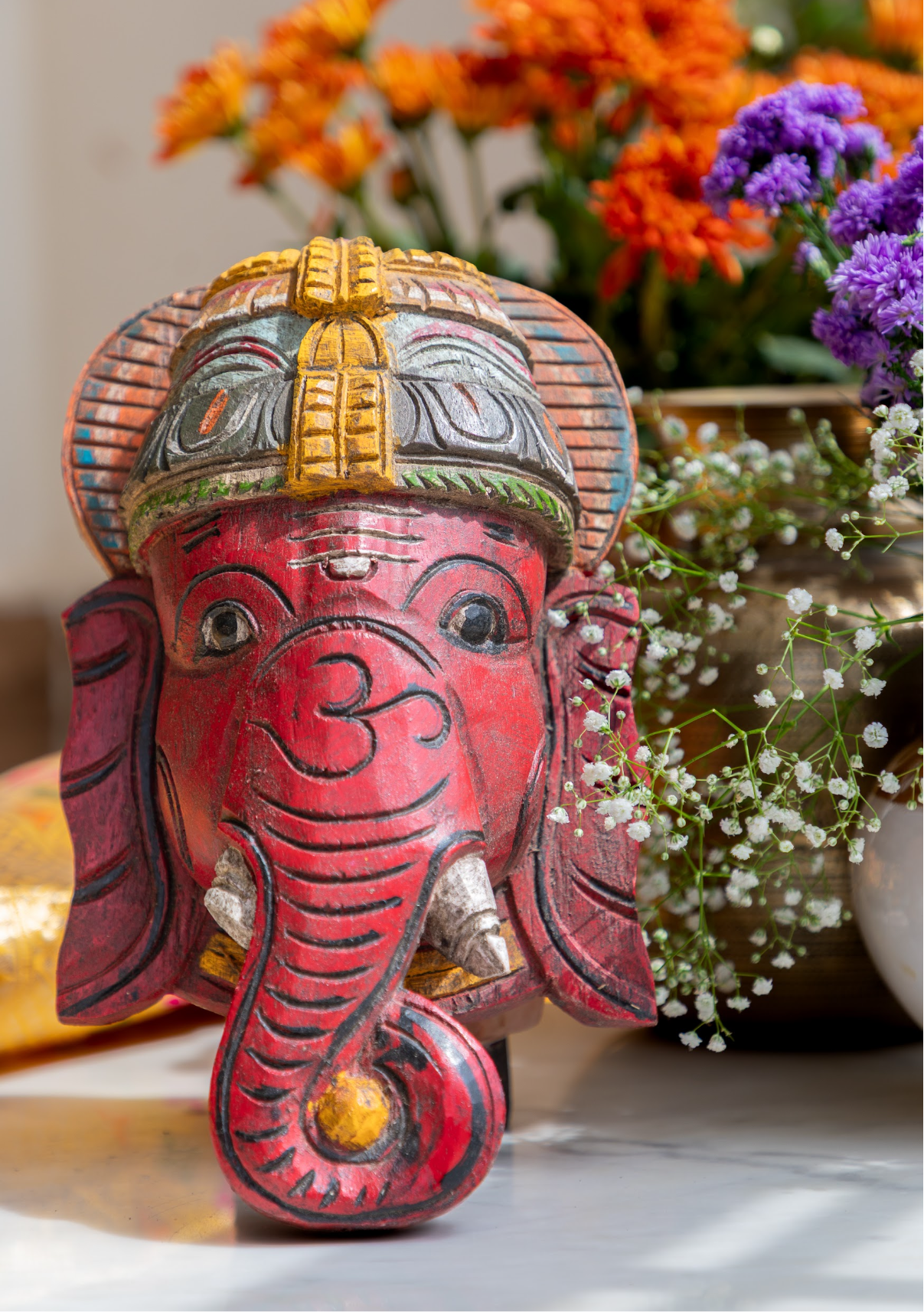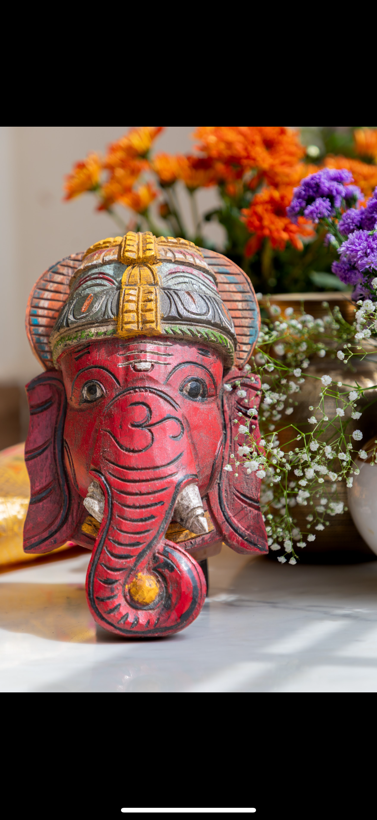 This piece fuses a hand-painted distressed orange Ganesha wall mask, the golden detailing on the mask and frame adds a touch of sacred elegance.