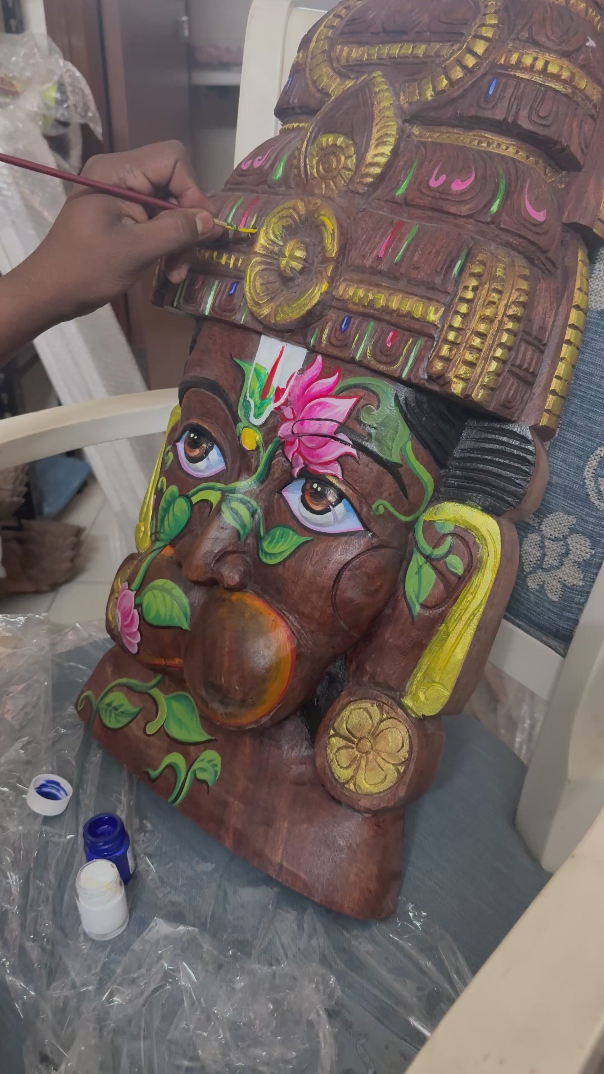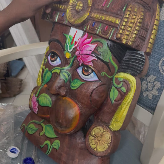 Wooden Hanuman idol is hand-carved from solid wood and brought to life with vibrant, hand-painted colours. The intricate detailing celebrates the strength and devotion of Hanuman, while the natural wooden base adds depth, warmth, and authenticity. A powerful fusion of traditional craftsmanship and bold colour, this piece makes a striking spiritual and artistic presence in any space.