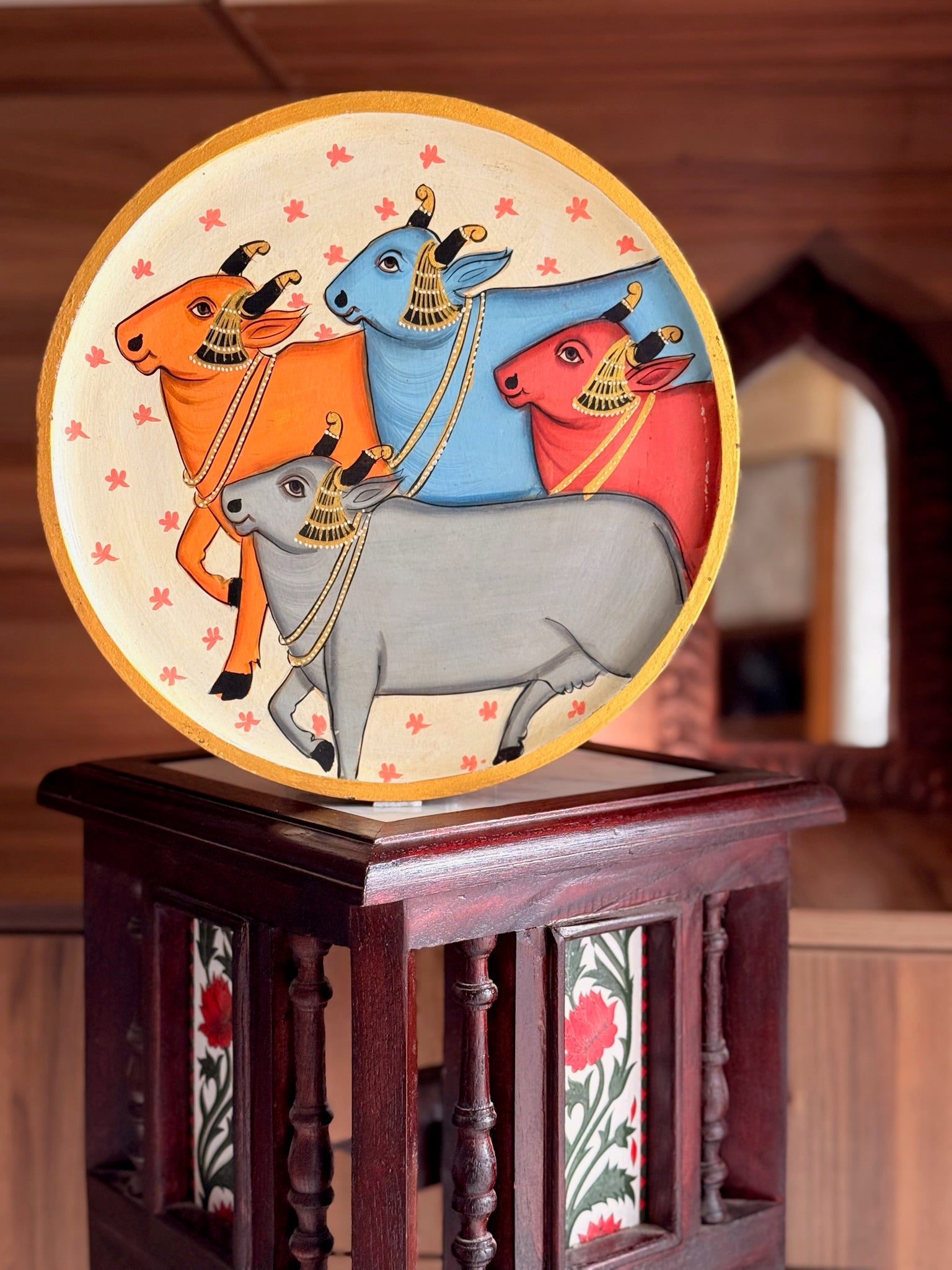 Add a touch of vibrant colour and timeless character to your walls with this hand-painted Pichwai-style wall plate. Rooted in the rich artistic heritage of Nathdwara, Rajasthan, this traditional form has been telling devotional stories for over 400 years through motifs like lotus flowers, cows, and gopis.